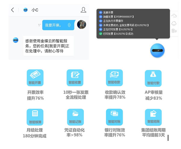 2.接入AI交互服務,智能財務機器人小K提供AI語音服務基礎(chǔ)設施、開票服務、銷售及庫存查詢服務和發(fā)票智能接收等服務,引領(lǐng)財務機器人2.0時代。
