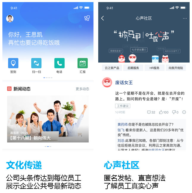 在同事圈“心聲社區(qū)”板塊,員工可以通過(guò)匿名方式表達(dá)情感、反饋問(wèn)題;智能助理“小云”可將高票答案推送給公司管理層,可作為決策參考。員工可以在同事圈搶占“公司頭條”,或是自定義標(biāo)語(yǔ)在云之家首頁(yè)進(jìn)行展現(xiàn),塑造個(gè)人品牌。新版同事圈還提供“多屏聯(lián)動(dòng)”方案,讓公司所有屏幕都展現(xiàn)同一內(nèi)容,實(shí)現(xiàn)企業(yè)文化“一鍵上墻”。