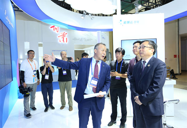 6月28日,金蝶中國總裁孫雁飛向工信部信軟司司長謝少鋒介紹金蝶云。